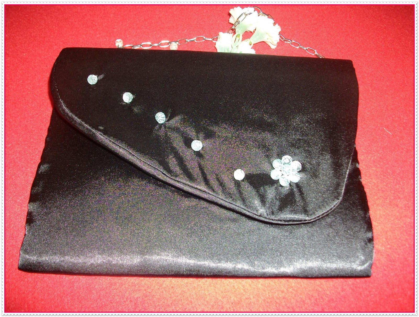 Little black satin dress accesorized with blue pearls. As you can see match very well with the purse!