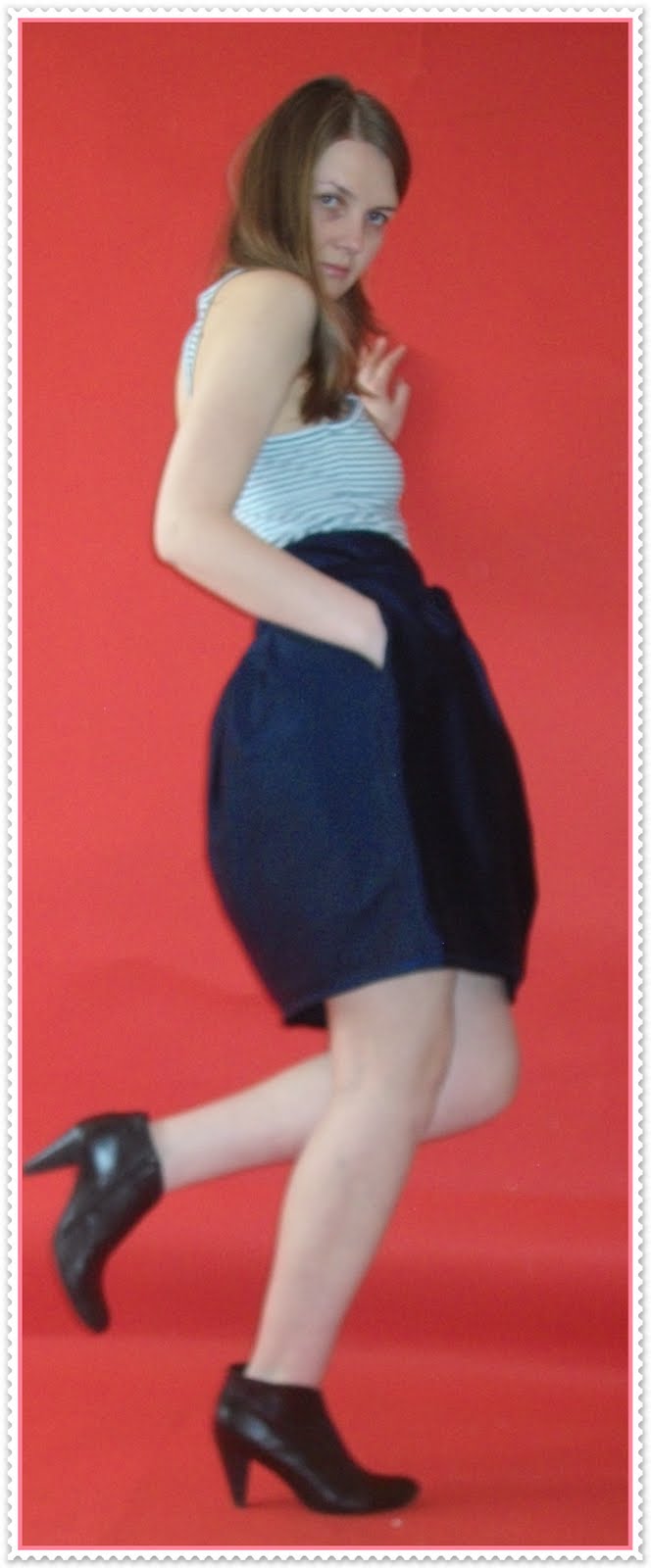Acest stil este adoptat si de mine: fusta midi din stofa albastru inchis, cu talie inalta, cu buzunare laterale... se inchide cu o fonta in fata.